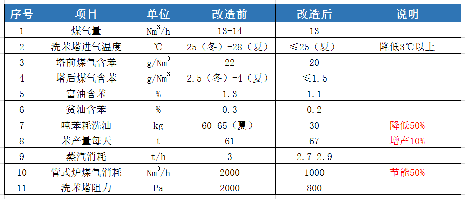 噸苯耗洗油:由之前的約60 kg降低到約30kg,降低50%;
